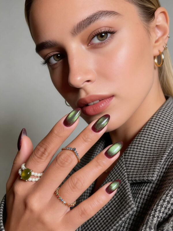 Our deep green cat eye medium length almond Nails like the cat’s eyes, with their lustrous appearance changing as the light shifts, are the must-have for you.