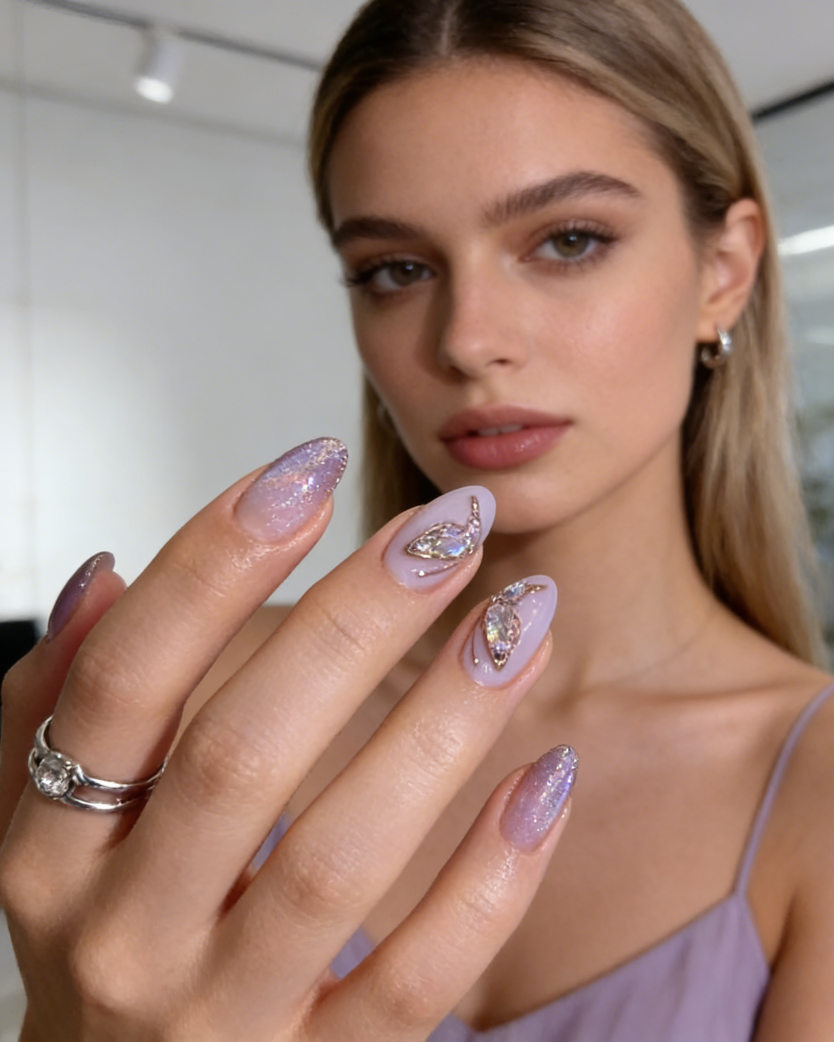 Add a touch of elegance and delicacy to your nails with these adorable butterfly-shaped light purple almond-shaped acrylic nail decorations.