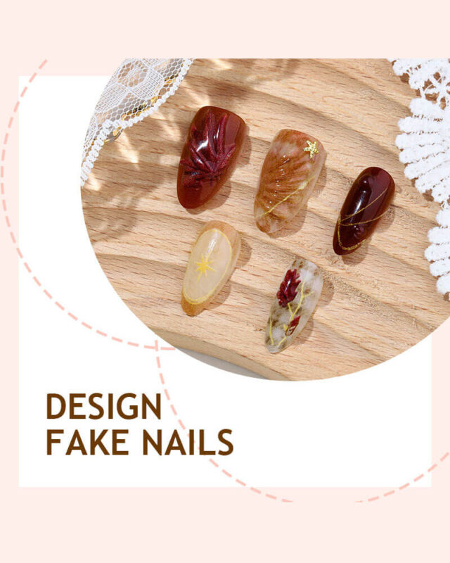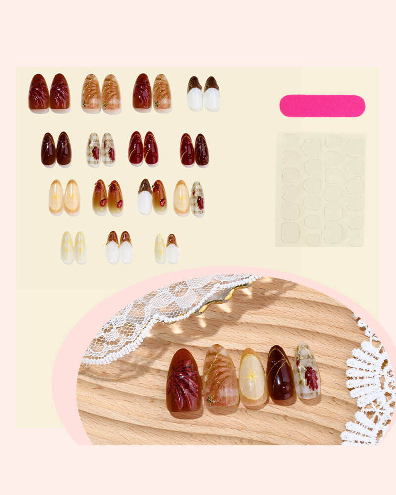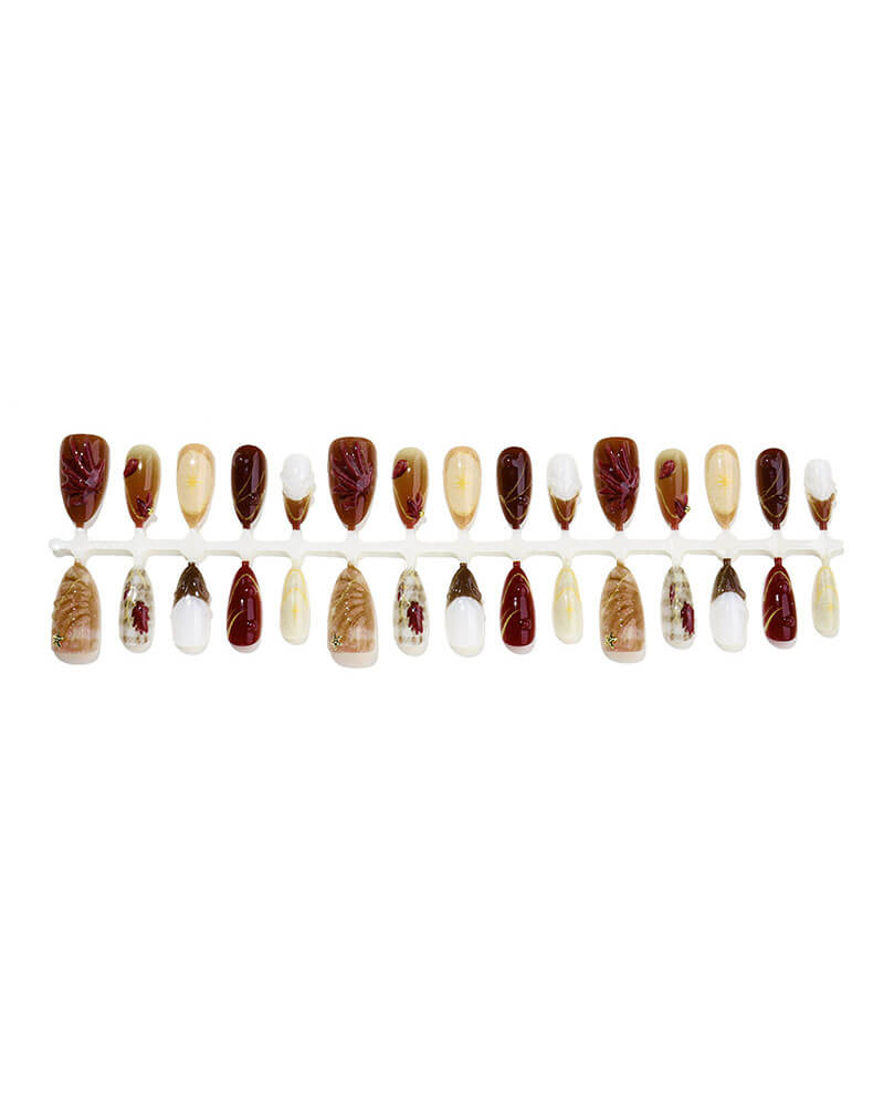 Our vintage 3D brownish red maple leaf nail features brown tone and maple leaf and star design, suitable for autumn and winter.